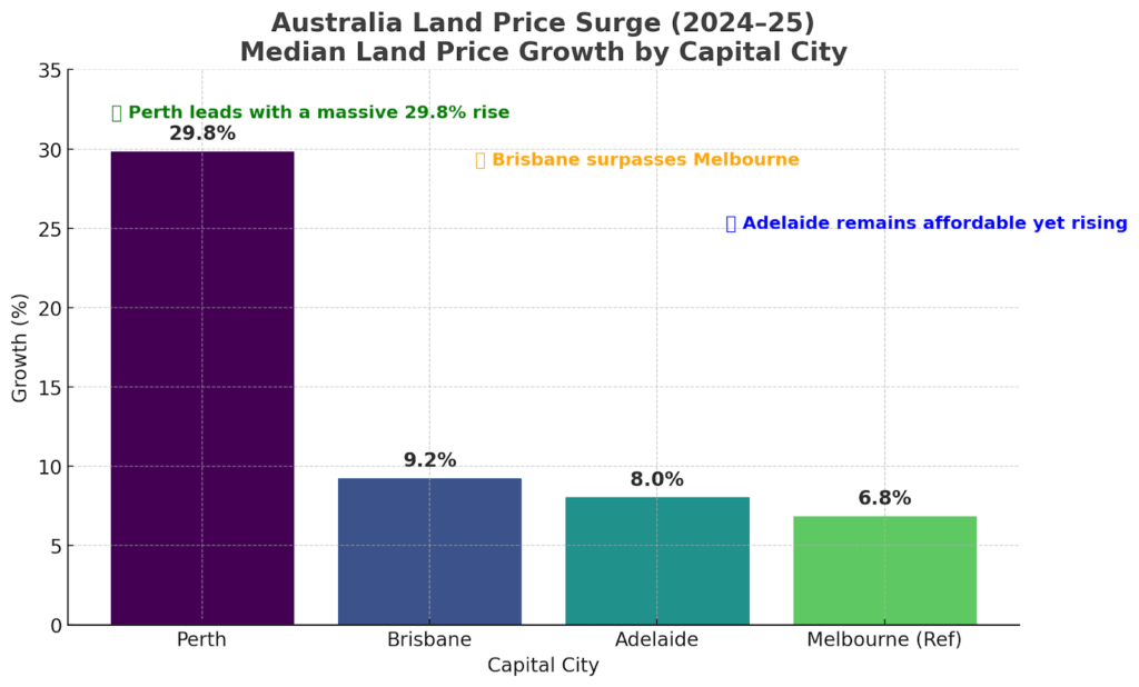 In practice, this means lot prices are soaring in many markets. Perth’s lot prices leapt 29.8% in the last year, nearly catching Melbourne. Brisbane’s lots grew 9.2%, passing Melbourne for the first time. Even Adelaide saw an 8% rise despite still being the nation’s most affordable capital. These numbers show the relative advantage of WA, SA and Queensland land is shrinking fast as demand chases the limited supply.