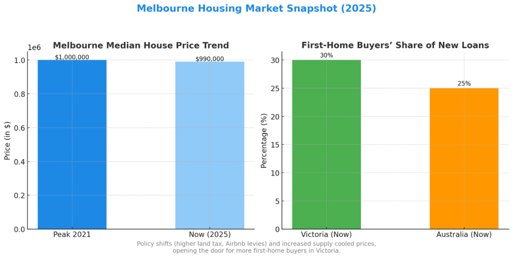 Melbourne’s housing market has slowed down from its highest point, making it a good time to buy. In 2021, the average house price was over $1 million, but now it’s about $10,000 less. This change has happened mainly because of new government rules and more homes being built. The Victorian government introduced higher land taxes on investors (roughly $1,300 a year on a $650K home) plus levies on Airbnb and vacant homes. These moves have slowed investor competition, giving first-home buyers a better chance, first-home buyers now make up nearly 3 in 10 new home loans in Victoria, even as their share fell nationwide.