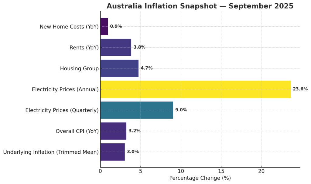The biggest pressure came from housing and utilities. Electricity prices alone soared 9.0% during the September quarter and 23.6% over the year, helping push up the overall housing group, which includes rents, utilities, and new home costs, by about 4.7%. By comparison, rents rose more slowly (around +3.8% year-on-year) and the cost of new homes increased just +0.9%.